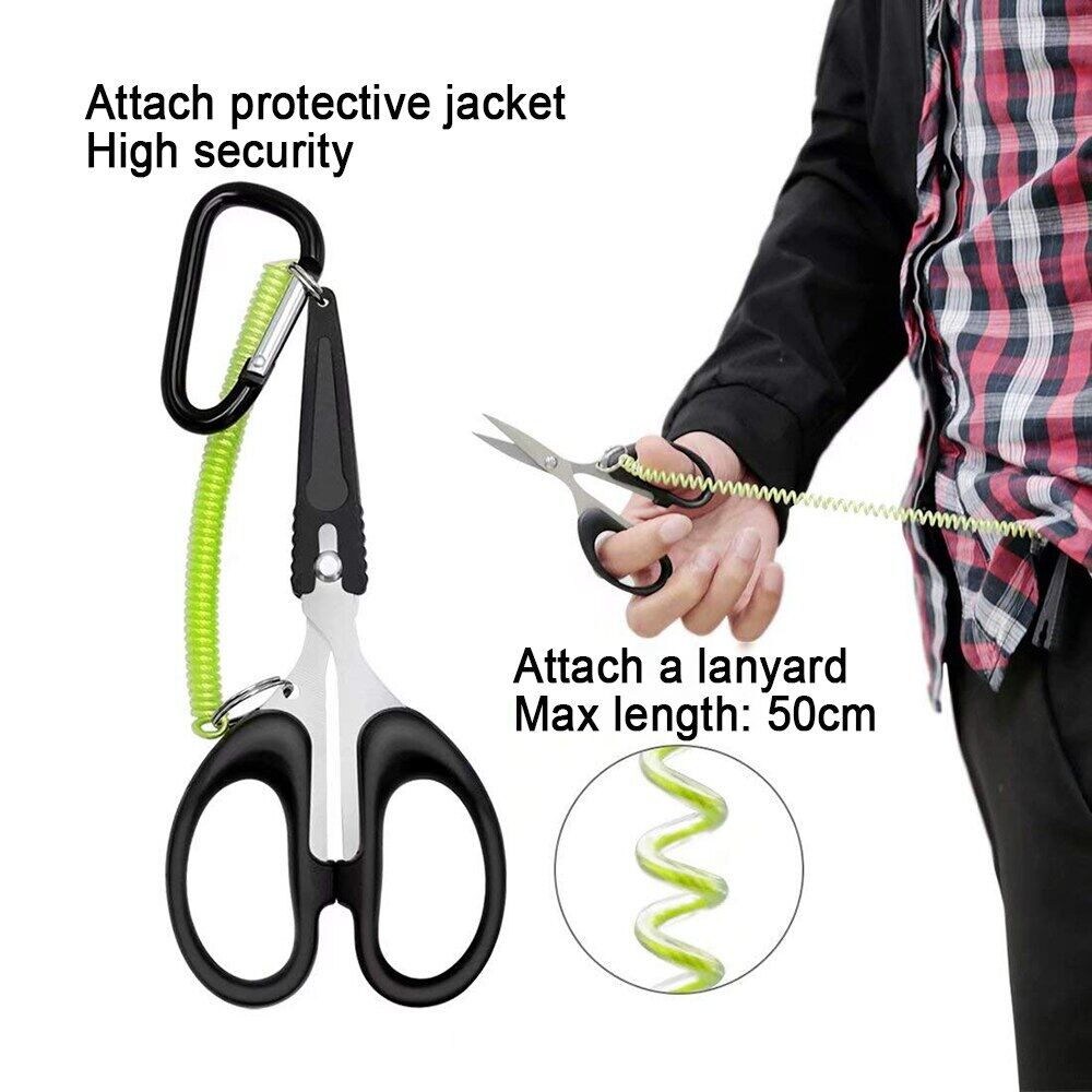 omes with a spiral cord and a carabiner, it can be attached to the belt, which prevent it from falling, losing and misplacement. A storage case is also provided. When not in use, you can insert the fishing scissors into the storage case. It is convenient and safe to carry the scissors.