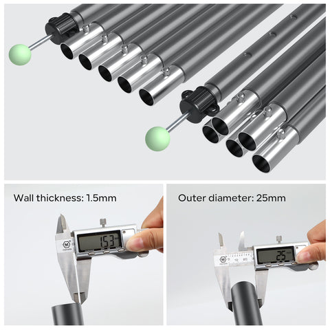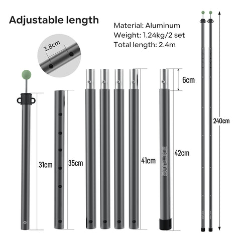 1. Tarp Poles Aluminum Provides Easy Way for Carry:Our tent poles are made from 6061 aluminum alloy, it's only 1.24 kg/2.73lbs,with the additional bag make the collapsible pole well to carry