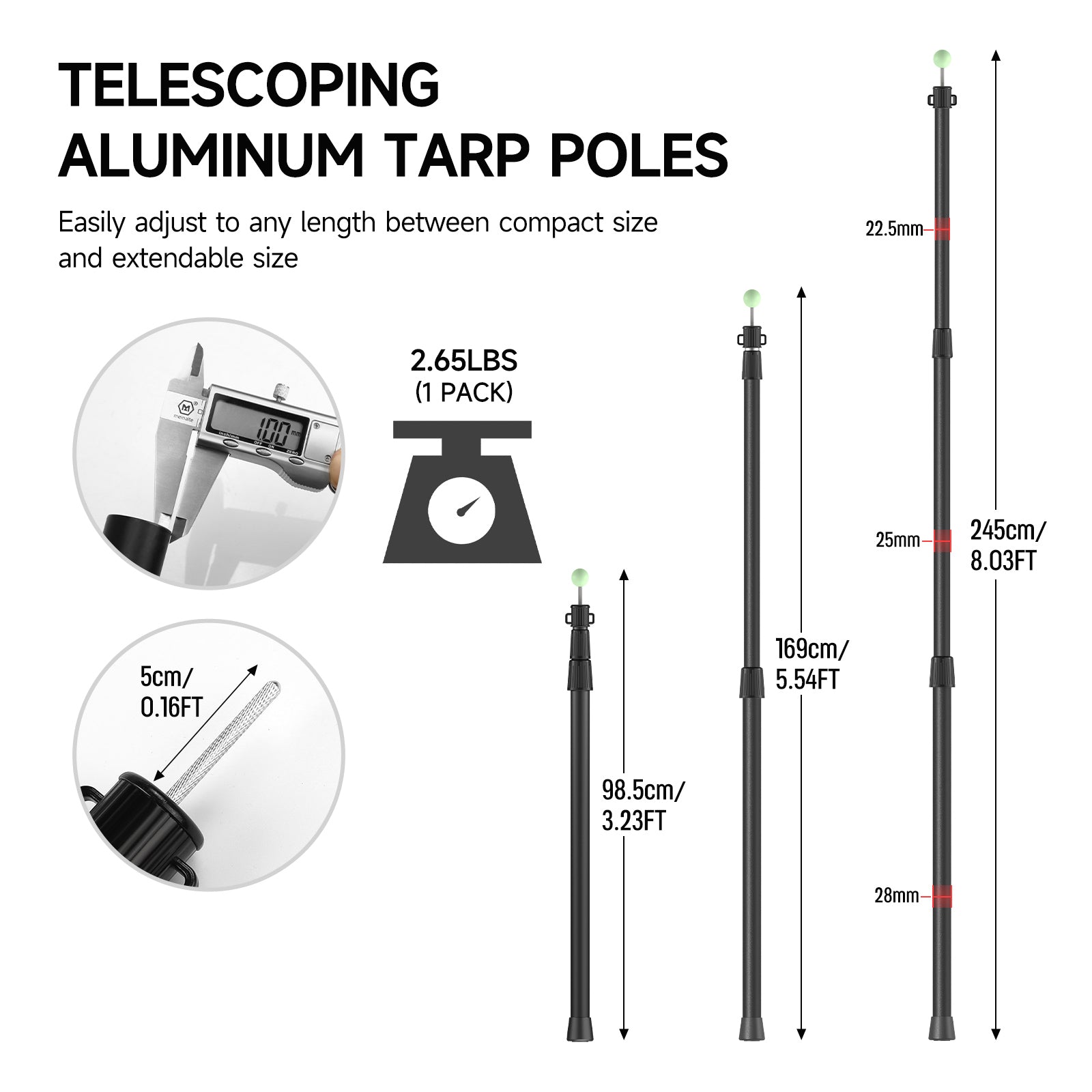 2. Adjustable tent poles extend from 3.23 Feet to 8.03 Feet in length, so you can position them at any length in between.